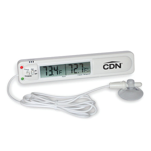 Alarm, Audio/Freezer/Refrigerator, -58°F to +158°F (-50°C to +70°C), signal sounds at 15° or 45°F/-9.4° or 7.2°C, 39" (1 m) sensor cable, shatterproof, dual progress display, alarm, audio/visual, sliding mode switch, temperature guide on thermometer, Velcro ® suction, ABS plastic