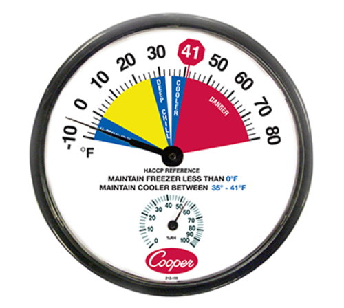 Freezer/Cooler Thermometer, 12" (30.5cm) dia. dial, temperature range -10° to 80°F, ±2°F temp. accuracy, features HACCP reference color zone, 0% to 100% relative humidity (replaces 212-156-8 & 212-157-8) (10 master carton) (Cooper)