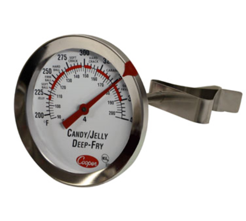 Candy/Deep Fry/Jelly Thermometer, zoned 2-1/2" (6.3cm) dia. dial type with 6" (15.2cm) stem length and .250" (.635cm) shaft dia., adjustable clip, temperature range 200° to 400°F (90 to 200°C), ±5°F temperature accuracy, NSF (carded) (36 master carton) (Cooper)