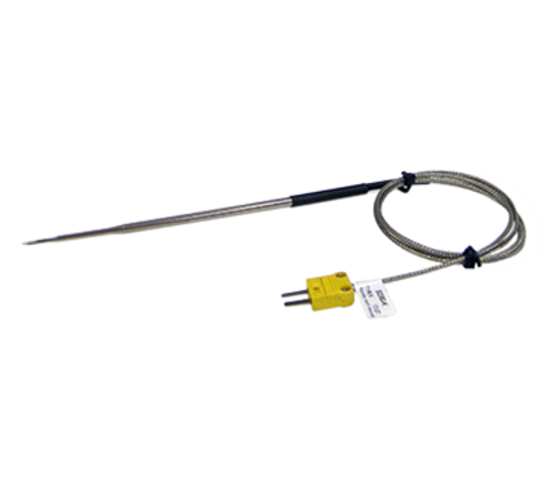 Needle Tip Probe, 5-1/2" (140mm) shaft length, 3/16" (5mm) shaft dia., .085" (2mm) tip dia., -40° to 500°F/-40° to 260°C temperature range, response time 2 seconds in liquid, 35" (889mm) stainless steel braided cable, Type K (Atkins)