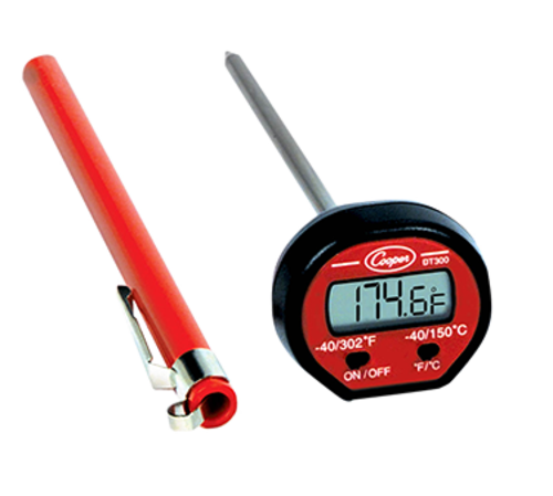 Test Thermometer, oval style, digital display with 5" stem, temperature range -40 to 302°F/-40° to 150°C, ±2°F/1°C from -10° to 212°F (-23° to 100°C) ±4°F (2°C) all other range temperature accuracy, 1" head, on/off switch, antimicrobial additive, 1.5V #A76 battery, CE, WEEE, RoHS (36 master carton) (Cooper)