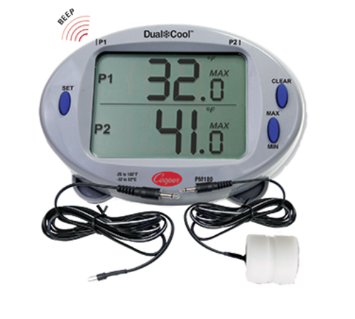 Dual-Cool™ Thermometer, digital, 2-1/8" x 2-7/8" (5.4 cm x 7.3 cm), temperature range: -25° to 180°F (-32° to 82°C), accuracy ±2°F (±1°C), includes: (1) 2013 air probe (accuracy ±0.4°F (±0.2°C) with temperature 32° to 158°F/0° to 70°C) & (1) 2113 solid simulator probe (accuracy ±0.4°F (±0.2°C) with temperature 32° to 158°F/0° to 70°C), interchangeable probes, min/max alarm setting, Hi/Lo temperature recall, for reach-in/walk-in or hot-holding cabinets, mounting bracket with screws & adhesive tape, CR2032 battery included, CE, RoHS (Cooper)