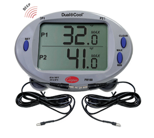 Dual-Cool™ Thermometer, digital, 2-1/8" x 2-7/8" (5.4 cm x 7.3 cm), temperature range: -25° to 180°F (-32° to 82°C), accuracy ±2°F (±1°C), includes: (2) 2013 air probe (accuracy ±0.4°F (±0.2°C) with temperature 32° to 158°F/0° to 70°C), interchangeable probes, min/max alarm setting, Hi/Lo temperature recall, for reach-in/walk-in or hot-holding cabinets, mounting bracket with screws & adhesive tape, CR2032 battery included, CE, RoHS (Cooper)
