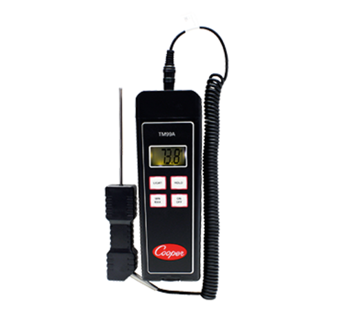 Thermistor Temperature Tester, single zone, digital with model 1050 Vet probe, 5" x 2" x 10", temperature range -40 to 302°F (-40 to 150°C), ±0.3°F ( ±0.2°C) or ±0.5° of reading (whichever is greater) temperature accuracy, scan mode, auto shut-off, backlight, sealed keypad, storage case, 9V battery (Cooper)