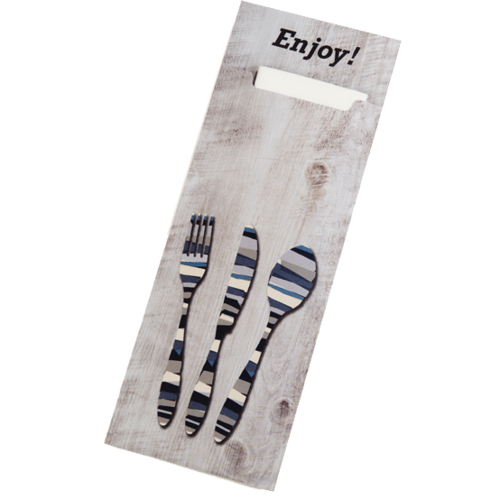 Cutlery Caddy, paper sleeve, pre-loaded with airlaid 16" x 13" napkin, insert stainless or plastic utensils, Enjoy (woodgrain) (pack of 325)