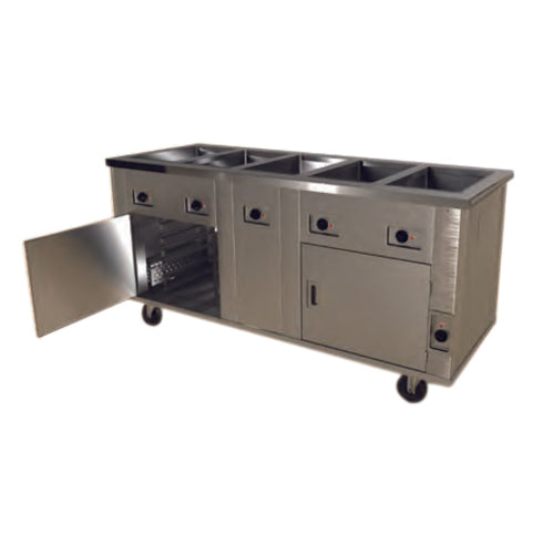 DineXpress™ Hot Food Serving Counter, electric, 32"L x 36"H, (2) wells with 1000w element with thermostat each, mobile modular design with interlocking mech., 14 gauge stainless steel top, heated storage base with pan slides, manifold drains standard, stainless steel front & end panels, 5" casters, NSF, UL, 3kw