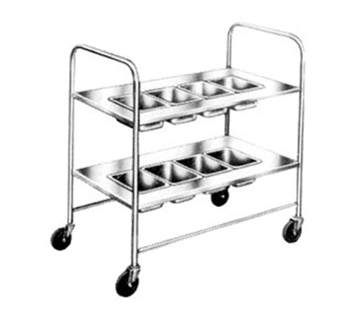Silverware Cart, (4) pans on top shelf, solid lower shelf, tubular stainless steel frame with (2) push handles, stainless steel shelf, 4" swivel casters
