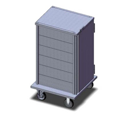 TQ Economy Room Service Tray Delivery Cart, (1) door, 1-compartment, 42-5/8"H, enclosed, (6) tray capacity, designed to hold multiple tray sizes (14" x 18", 15" x 20", 13" x 21”, & Dinex room service trays), fixed tray slides with 5-1/4" spacing, one tray per slide, optional push handle, fixed panels, pull type door with drop latch, (4) 5" plate-type casters, 2 swivel with brakes, 2 fixed without brakes, stainless steel construction, CSA, Made In USA (ICT/6S)