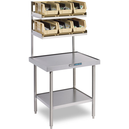 Mini Starter WorkStation, 30"W x 24"D, 14 gauge/304 stainless steel top, full marine edge, under brace hat channels, 2 cantilever overshelves, open 16 gauge/304 stainless steel undershelf, fully welded tubing 16 gauge/304 stainless steel legs, No. 4 finish, CSA