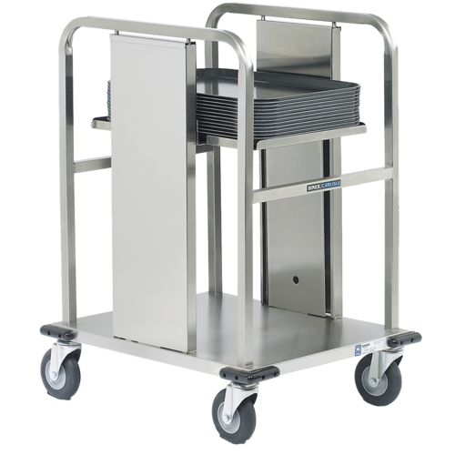 Mobile Tray Dispenser, maximum. tray size 15" x 20", 100 capacity, open, single solid shelf, removable carrier, adjustable lifting rate, (4) 5"HD non- marking swivel casters (2 with brakes) & bumpers, stainless steel construction, CSA (IDT1S/1520)