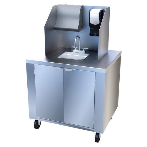Mobile Handwashing Station, self-contained, 36"W x 28"D x 56"H, includes; (2) 5 gal. clean water & (2) 6 gal. waste water tanks, (1) 2.5 gal water heater, (2) paper towel roll holders, (1) electric water pump (1 GPM output), sink, manual faucet, 21" backsplash with manual soap dispenser and c-fold towel dispenser, enclosed cabinet base, stainless steel, 5" standard casters, 120v, cord