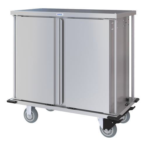 TQ Compact Meal Delivery Cart, (2) door, 2-compartment, 41-9/10"H, enclosed, (12) tray capacity, designed to hold multiple tray sizes (12" x 19", 12" x 20", 14" x 18", 15" x 20", & DXRST152003), 4-3/4" tray height spacing, one tray per slide, vertical push handles, vented side panels, gravity locking door with door stop, corner bumpers, (4) 6" Performa casters (2 rigid, 2 swivel with Tech lock brakes) with noise suppression bearing covers, stainless steel construction, NSF, Made in USA