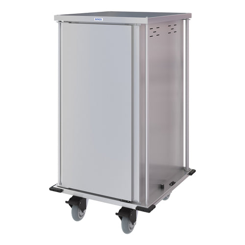 TQ Compact Meal Delivery Cart, pass thru, (1) door, 1-compartment, 56-1/6"H, enclosed, (18) tray capacity, designed to hold multiple tray sizes (12" x 19", 12" x 20",14" x 18", 15" x 20" & DXRST152003), 4-3/4" tray height spacing, two trays per slide, vertical push handles, vented side panels, gravity locking door with door stop, corner bumpers, (4) 6" Performa casters (2 rigid, 2 swivel with Tech lock brakes) with noise suppression bearing covers, stainless steel construction, NSF, Made in USA