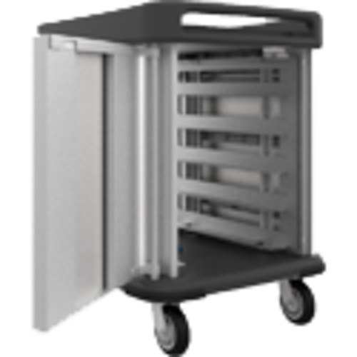 TQ Supreme Meal Delivery Cart, pass thru, (2) door, 1-compartment, 43-2/5"H, enclosed, (10) tray capacity, designed to hold multiple tray sizes (14" x 18", 15" x 20", 12" x 19", & 12" x 20"), two trays per slide, 5-1/4" tray height spacing, 4-sided rail top, horizontal and vertical push handles, swing type door with magnetic catch, sound dampening design, full perimeter bumper, floor drain, (4) 6" casters, 2 swivel with Tech lock brakes, 2 rigid, stainless steel construction, NSF, Made in USA