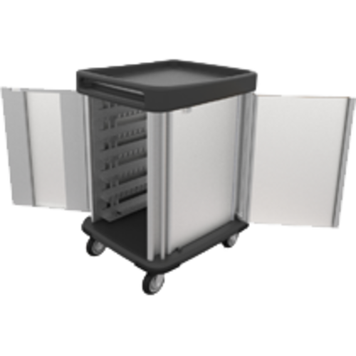 TQ Supreme Meal Delivery Cart, pass thru, (2) door, 1-compartment, 58-5/8"H, enclosed, (12) tray capacity, designed to hold multiple tray sizes (14" x 18", 15" x 20", 12" x 19", & 12" x 20"), two trays per slide, 5-1/4" tray height spacing, 4-sided rail top, horizontal and vertical push handles, swing type door with magnetic catch, sound dampening design, full perimeter bumper, floor drain, (4) 6" casters, 2 swivel with Tech lock brakes, 2 rigid, stainless steel construction, NSF, Made in USA