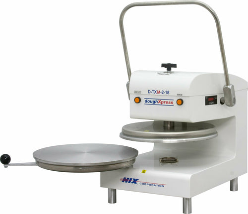 (11214) Tortilla/Pizza Dough Press, commercial manual, 18" diameter, uncoated aluminum platens, upper & lower platens heat to 450°F, digital timer & temperature controls, infinite range thickness adjustment, pull down handle, illuminated power on/off button, white powder finish, 220v/60/1-ph, 3100 watts, 15 amps, NEMA 6-20P, cETLus, ETL-Sanitation, Made in USA