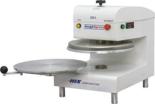 (11244) Pizza Dough Press, air-operated automatic (air compressor not included), up to 18" dia., uncoated aluminum platens, upper platen heat up to 200°F, digital time & temperature controls, infinite range thickness adjustment, power on/off button, two start buttons, emergency stop button, white finish, ETL-Sanitation, cETLus, CE, Made in USA