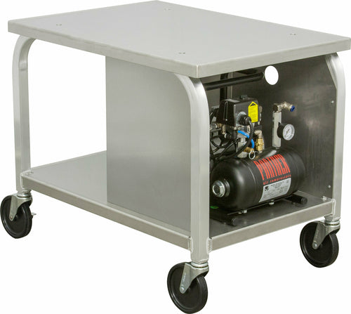(60591) Dough Press Cart, with silent air compressor, 16 ga stainless steel top with marine edge, 16 ga stainless steel bottom shelf in an enclosure, 1-1/4" aluminum frame, (4) 5" swivel wheels (2 front locking), 1/2 HP, 400 watts, 110v/60/1-ph