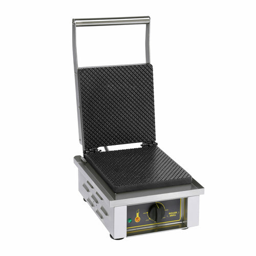 Roller Grill Waffle Baker, electric, single, cast iron plates, "Cone" plate pattern, heavy duty top plate, heating zone thermostatically controlled up to 570°F, stainless steel construction, wraparound removable stainless steel drip tray, 120v/60/1-ph, 14.0 amps, 1.75kW, NEMA 5-15P, UL