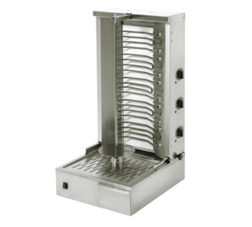 Roller Grill Gyro Grill, 88 lb. meat capacity, 3 independently controlled heating zones, 5 heating elements, stainless steel construction, ceramic stones, stationary spit with adjustable meat support platform, grease pan & removable drawer, 208/240v/60/3-ph, 15.0/17.0 amps, 6.0kW, NEMA L15-30P, UL