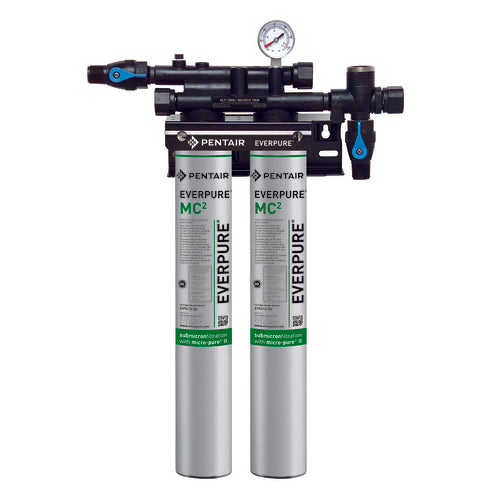 QC7I Water Filtration System, QC7I Twin - MC², Twin, (2) MC² Precoat primary filtration cartridge, reduces chlorine, taste & odor, outlet pressure gauge, water shut-off valve, flushing valve, 18,000 gallons, 3.34 gpm, 0.2 micron, 3/4" inlet, 3/4" outlet, NSF 42 & 53 (EV927502)