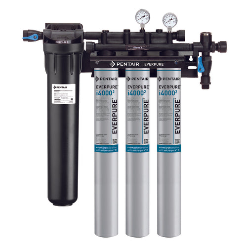 Insurice® Water Filtration System, Insurice® Triple PF-i4000², Triple, (1) EC210 Prefilter, (3) i4000² Micro-Pure® II Precoat primary filtration cartridge, reduces chlorine, taste & odor, inhibits scale, inlet pressure gauge, outlet pressure gauge, flushing valve, 36,000 gallons, 5.0 gpm, 0.5 micron, 3/4" inlet, 3/4" outlet, NSF 42 & 53 (EV932523)