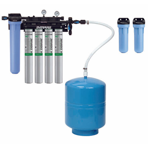 CSR Water Filtration System, CSR Plus-XC2, Quad, (1) EC210 Prefilter, (4) XC Precoat primary filtration cartridge, reduces chlorine, taste & odor, (2) remote mount SR-X scale reduction feeders, (1) 9 gallon surge tank, inlet pressure gauge, outlet pressure gauge, flushing valve, 48,000 gallons, 10.0 gpm, 0.5 micron, 3/4" inlet, 3/4" outlet, NSF 42 & 53 (EV934710)