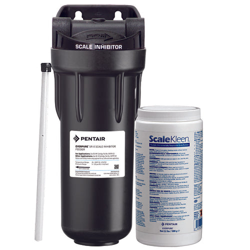 SR-X Feeder and Deliming System, (1) Everpure® SR-X Scale Inhibitor, (1) SR-X Housing, (1) SS-10 scale reduction cartridge, dip tube, 2.2 lb. Pentair Everpure® ScaleKleen package, 6.0 gpm, 3/4" inlet, 3/4" outlet, NSF 42 (EV979720)