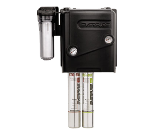 MRS Reverse Osmosis System, MRS-100, Twin, (1) 6TO-BW granular activated carbon cartridge, reduces chlorine, taste & odor, (1) MR-100 mineral reduction cartridge, inlet pressure gauge, outlet pressure gauge, wall mount, 100 gpd, 3/8" inlet, 3/8" outlet (EV997007)