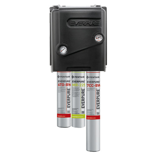 MRS Reverse Osmosis System, MRS-225CCBL, Triple, (1) 6TO-BW granular activated carbon cartridge, reduces chlorine, taste & odor, (1) MR-225 mineral reduction cartridge, (1) 7CCBW calcium carbonate cartridge, inlet pressure gauge, outlet pressure gauge, wall mount, 225 gpd, 3/8" inlet, 3/8" outlet (EV997019)