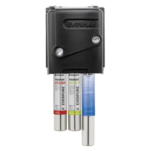 MRS Reverse Osmosis System, MRS-225BL, (1) 6TO-BW granular activated carbon cartridge, reduces chlorine, taste & odor, (1) MR-225 mineral reduction cartridge, (1) BW-4400 cartridge, inlet pressure gauge, outlet pressure gauge, wall mount, 225 gpd, 3/8" inlet, 3/8" outlet (EV997077)