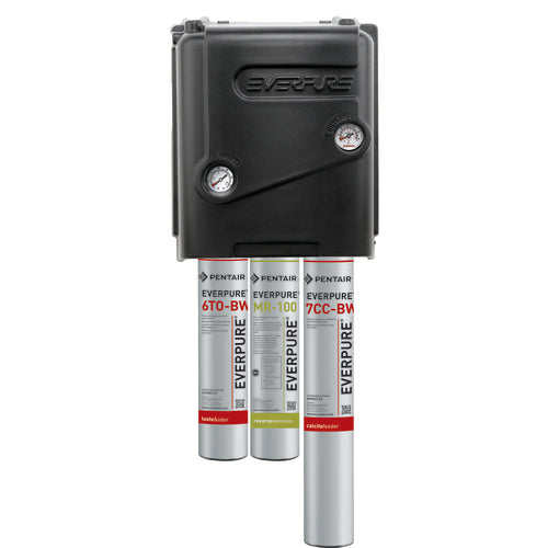 MRS Reverse Osmosis System, MRS-100CC-BL, (1) 6TO-BW granular activated carbon cartridge, reduces chlorine, taste & odor, (1) MR-100 mineral reduction cartridge, (1) 7CC-BW cartridge, inlet pressure gauge, outlet pressure gauge, wall mount, 100 gpd, 3/8" inlet, 3/8" outlet (EV997363)