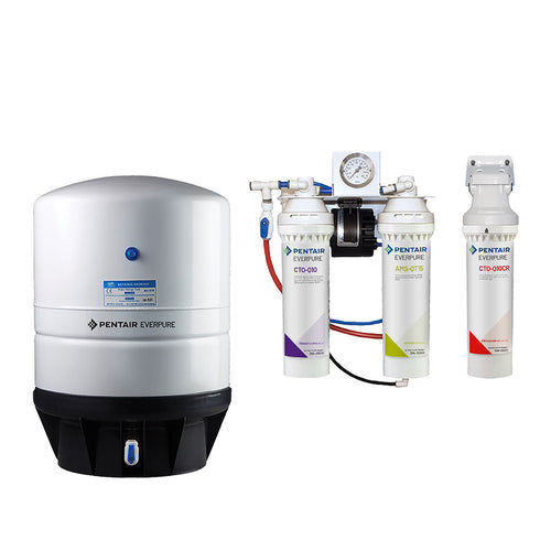 Reverse Osmosis System, 10 gallon hydropneumatic storage tank, up to 175 gpd production, operates at line pressure (non-electric), particulate & chlorine reduction prefilter, mineral-addition cartridge, post‐filter for chloramine reduction, full system bypass valve and valve-in-head system shut off, includes hose, tubing & fittings for installation, compact wall-mount processor with remote storage tank provides installation flexibility (164-01410)