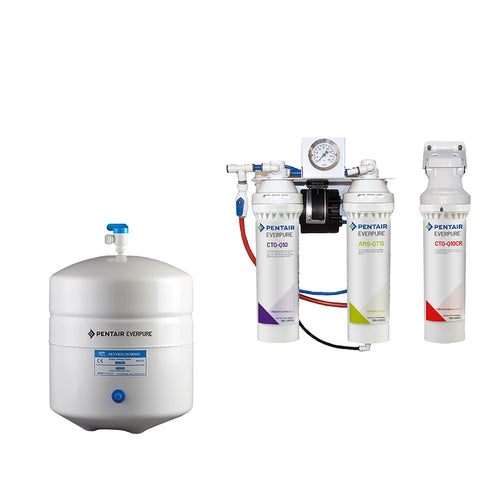 Reverse Osmosis System, 2.5 gallon hydropneumatic storage tank, up to 175 gpd production, operates at line pressure (non-electric), particulate & chlorine reduction prefilter, mineral-addition cartridge, post‐filter for chloramine reduction, full system bypass valve and valve-in-head system shut off, includes hose, tubing & fittings for installation, compact wall-mount processor with remote storage tank provides installation flexibility (164-01402)