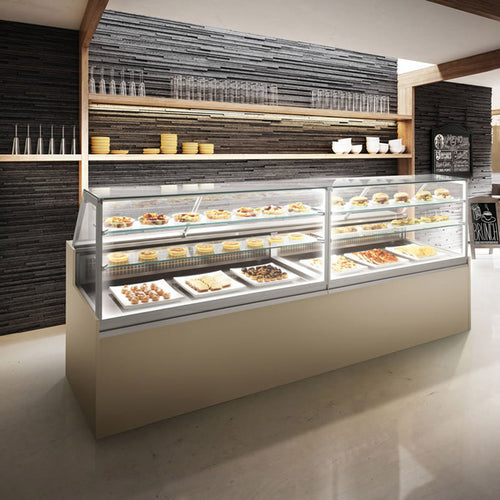 Frigomeccanica Just Hot/Cold Display Case, 60-3/5"W x 34-3/10"D, height to be specified, self-contained, 38° - 45°F temperature range, LED lighting, tubular anodized aluminum, display top stainless steel, polyurethane insulation, tempered glass, automatic defrost with electric heating element, control panel with electronic thermostat, heated glass anti-mist system, 1/3 HP, 412 watts, 220v/60/1-phase, 15 amps, CE, cETLus, ETL (contact factory for price)