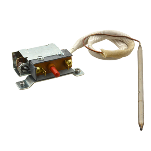 High Limit, 20" capillary, 3-1/4"W x 2-1/2"D, 1/4" tab terminals, up to 400° F temperature, hi-temp capillary sleeve, manual reset, 5-3/4" bulb, (used on all gas fryer models after 2006)