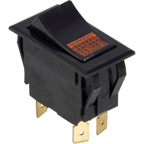 Lighted Rocker Switch, 15/16"L x 1-11/16"W x 1-9/16"D overall, on/off, SPST, fits 7/8" x 1-1/2" opening, (4) 1/4" tab terminals, amber lens, plastic, black, 120-250v, 10 amps at 250v, 15 amps at 125v (Dean/Frymaster 8073574, fits 24G SERIES (FLAT BOTTOM))