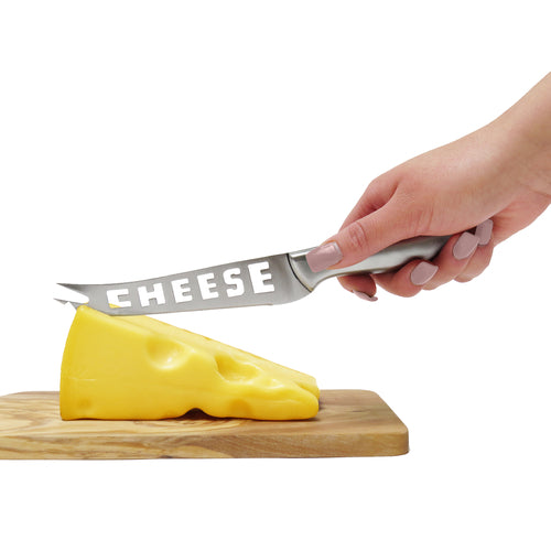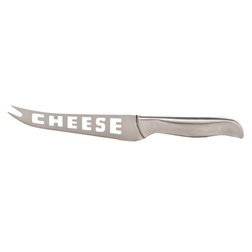 Cheese Knife, 9-3/8" long, serrated, "cheese" die cut into blade, with clear plastic box, stainless steel (factory box)