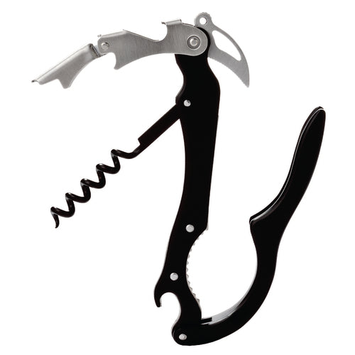 Bacchus™ Champagne/Wine Opener, 5-1/2" overall length, black spiral, serrated blade, two-step boot lever, bottle cap opener, screw tops, anodized aluminum exterior, black (premium carded)