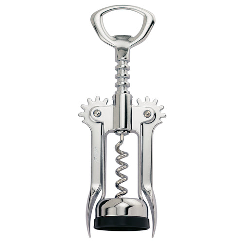 Wing Corkscrew, 6-5/8" overall length, open spiral, with bottle cap opener, expanded bottle base, chrome plated, silver, Made in Italy (premium carded)