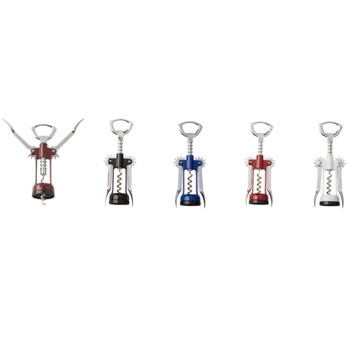 Wing Corkscrew, 6-5/8" overall length, open spiral, with bottle cap opener, expanded bottle base, chrome plated, enameled exterior, Made in Italy (retail box)
