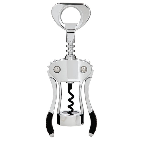 Primo Wing Corkscrew, 5-5/8" overall length, black open spiral, with bottle cap opener, rubber base on handles, chrome plated, silver, Made in Italy (premium carded)