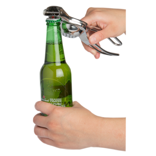 Lemon/Lime Squeezer, 8-3/8" long x 2-5/8"W, bottle cap opener, with strainer, stainless steel (premium carded)