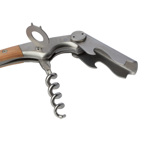 Clos Laguiole Waiter's Corkscrew, 5" overall length, elongated conical spiral, serrated blade, finger nail grip, bottle cap opener, (2) adjustable axis connections, juniper wood handle, includes: two-sided wrench, black leather sheath & box, Made in France (factory box)