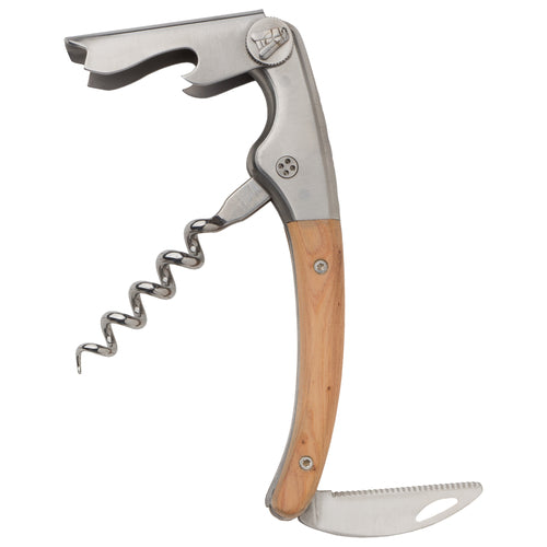 Clos Laguiole Waiter's Corkscrew, 5" overall length, elongated conical spiral, serrated blade, finger nail grip, bottle cap opener, (2) adjustable axis connections, olive wood handle, includes: two-sided wrench, black leather sheath & box, Made in France (factory box)