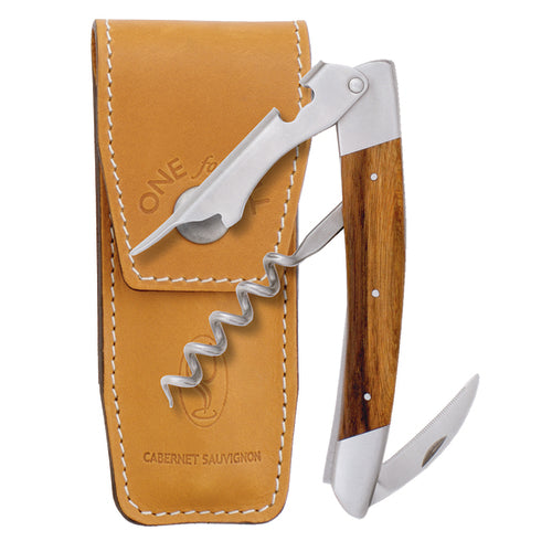 La Vigne Waiter's Corkscrew, 4-7/8" overall length, spiral, micro serrated blade, bottle cap opener, cabernet sauvignon wood handle, include: tan holster with belt loop, stainless steel, satin finish, Handmade in France (factory box)