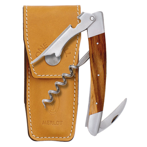 La Vigne Waiter's Corkscrew, 4-7/8" overall length, spiral, micro serrated blade, bottle cap opener, merlot wood handle, include: tan holster with belt loop, stainless steel, satin finish, Handmade in France (factory box)