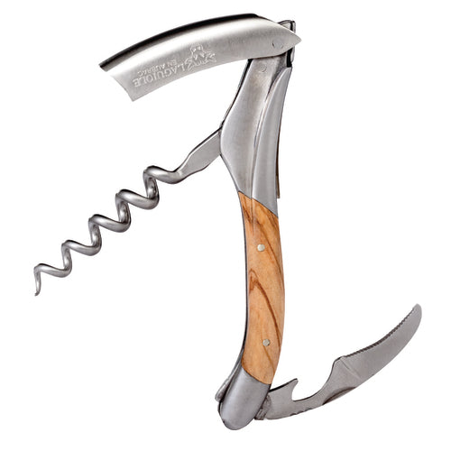 Laguiole en Aubrac™ Waiter's Corkscrew, 4-3/4" overall length, cone-shaped spiral, serrated blade & bottle opener combo, olivewood handle, includes: 6"W x 2-1/2"D x 1-1/2"H wood box, with black finish, Made in France (factory box)