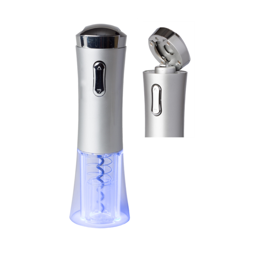 Quick-Cork™ Electric Corkscrew, 9"H, up/down switch, foil cutter top, incandescent blue light, rechargeable with adapter, ABS plastic, silver exterior (retail box)