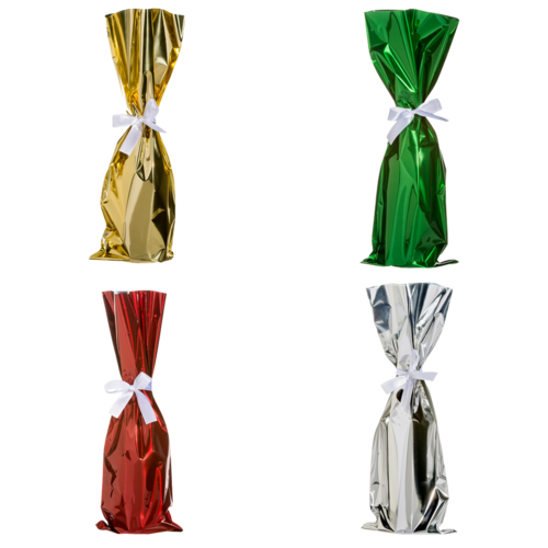 Wine/Champagne Bottle Bag, (1) bottle capacity, 6-1/2" dia. x 18"H, with 24" white ribbon, mylar, metallic (2 each per pack) (premium carded)